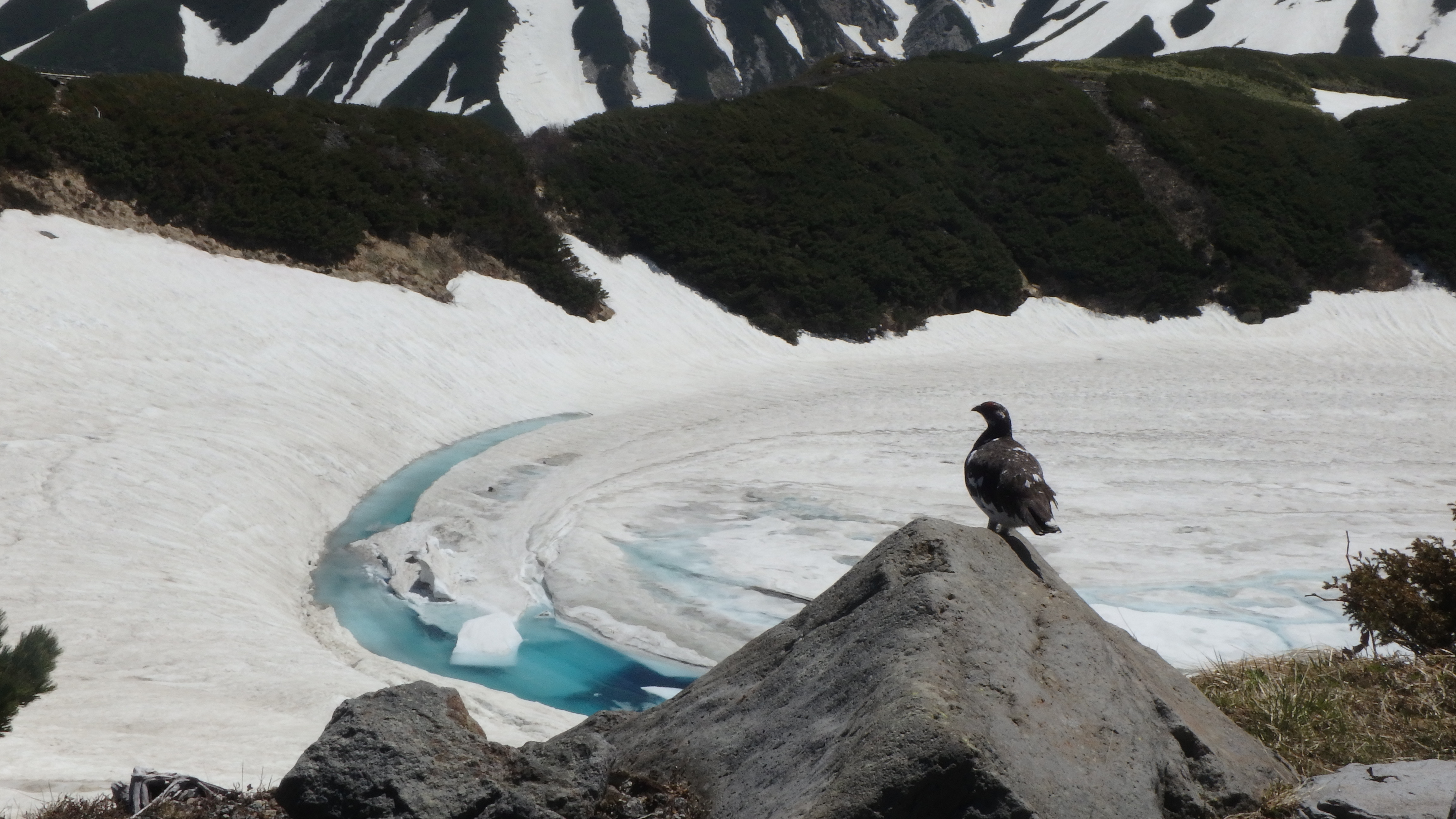 この時期まで雪遊びができるのは高地ならでは。ライチョウに出会うチャンスあり。